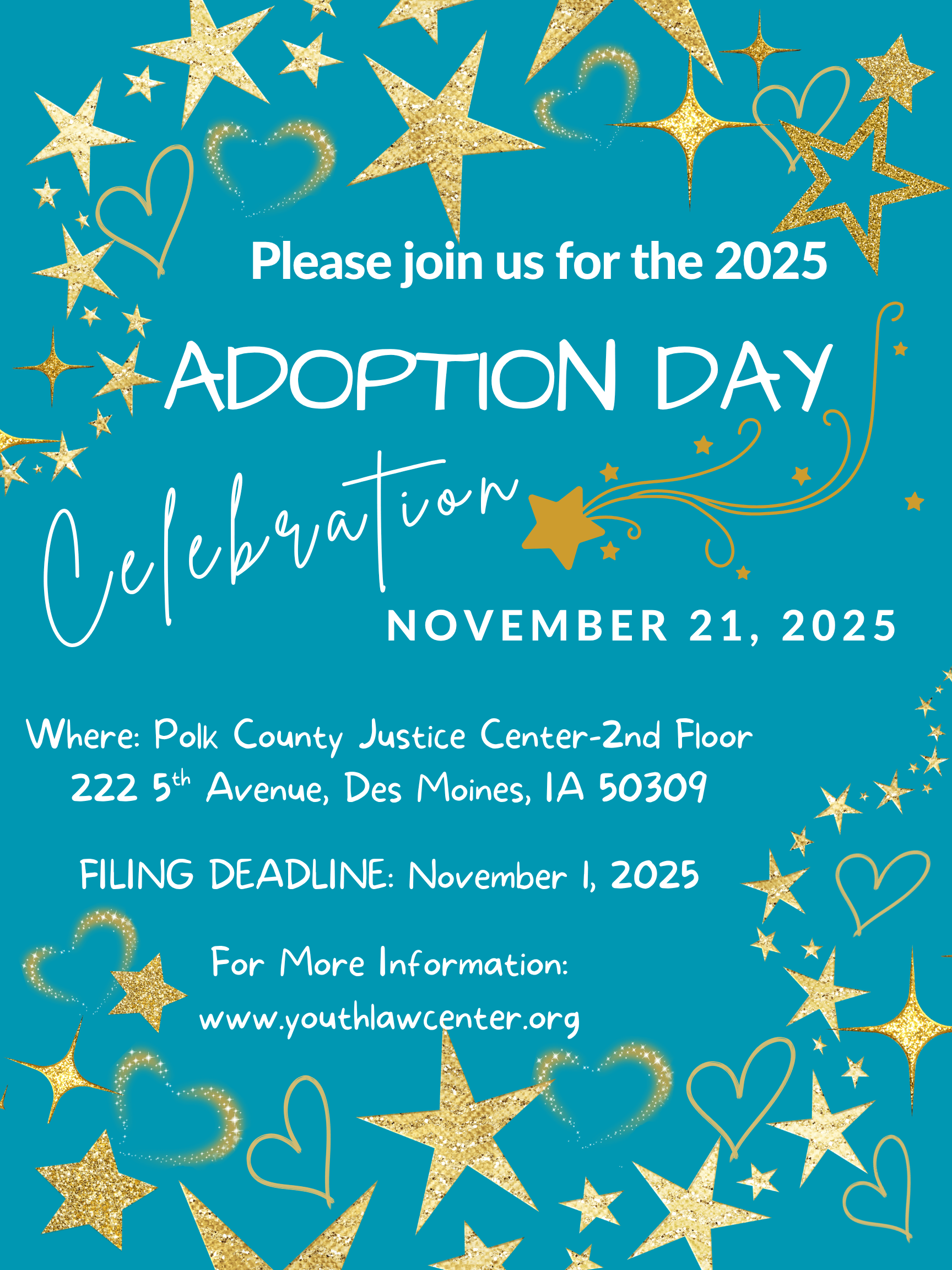 The 2025 Adoption Day Celebration will be on Friday, November 21, 2025 starting at 9:00 AM. It will be held on the second floor of the Polk County Justice Center (222 5th Avenue, Des Moines, IA).